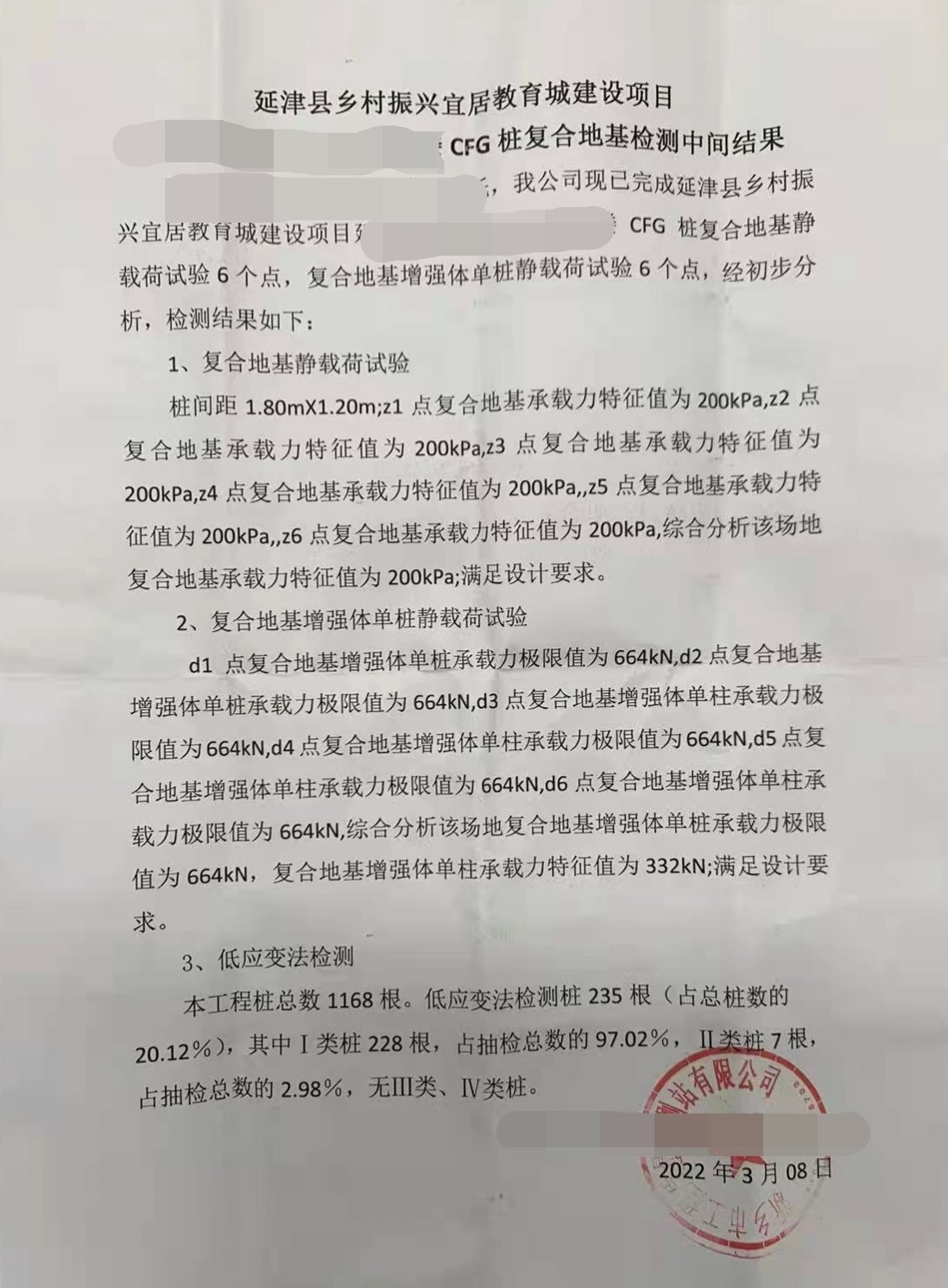 3月份延津鄉(xiāng)村振興教育城項(xiàng)目傳來(lái)喜訊,CFG樁復(fù)合地基檢測(cè)完成,檢測(cè)結(jié)果全部滿足設(shè)計(jì)要求,其中I類樁占抽檢總數(shù)的97.02%,II類樁占比2.98%,無(wú)III類樁、IV類樁,應(yīng)用效果顯著。